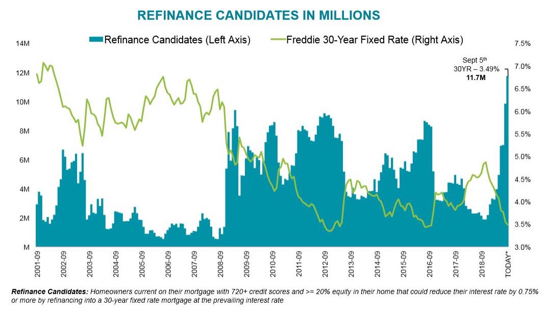 Buyers aren’t the only ones who can benefit from low mortgage rates. Homeowners can also take advantage. Whether ‘to refinance or not?’ is a common question when mortgage rates are low. Considering the state of current rates, it puts homeowners in a favorable position. Mortgage professionals saw a surge in refinancing applications over the summer months. In the beginning of August, refinancing saw an increase of 36.9 percent to a three-year high of 2,742.9 and accounting for 43 percent of all closed loans – a 29 percent rise from that time last year. A large group of homeowners, more than 11.7 million were eligible to apply for a refinance cutting at least 0.75% from their current rate.